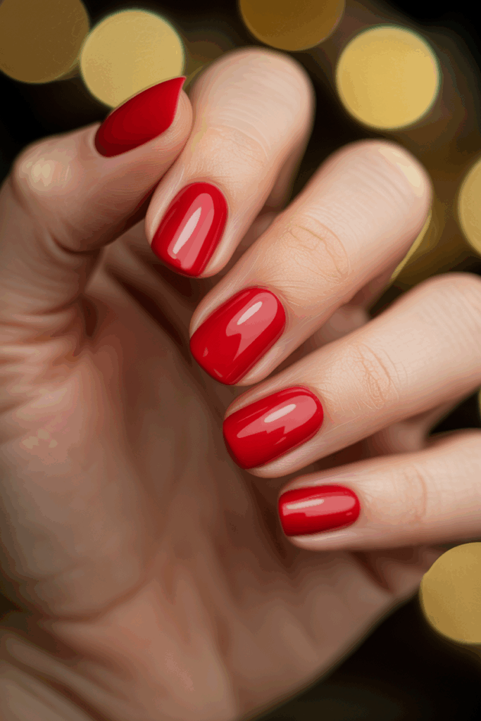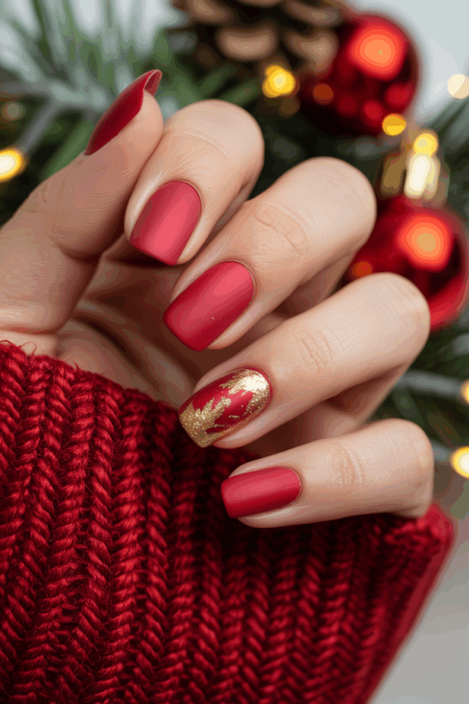 This style combines a smooth red matte base with delicate gold accents. The gold details add elegance without overpowering the look. It’s suitable for both casual gatherings and formal holiday events. The contrast between the matte finish and shiny gold creates a beautifully balanced design.