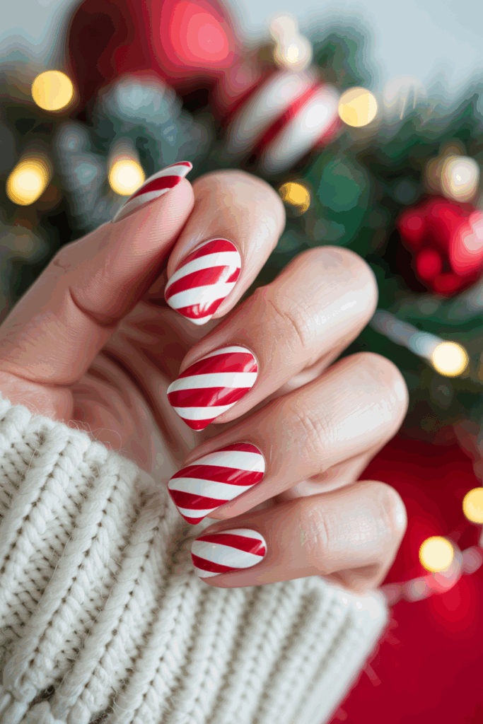Red and white stripes recreate the classic candy cane look in a fun and festive way. The stripes can be painted across the full nail or focused just on the tips. This design is simple, cheerful, and instantly brings holiday spirit to your manicure.