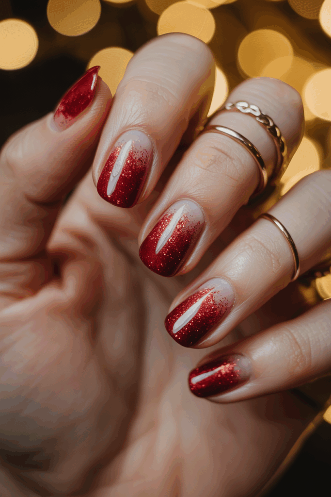 This design features a smooth blend from solid red into glittery tips. It adds sparkle in a subtle way without being overwhelming. The ombre effect looks stunning on both short and long nails. As the glitter catches the light, it creates a festive yet refined appearance.