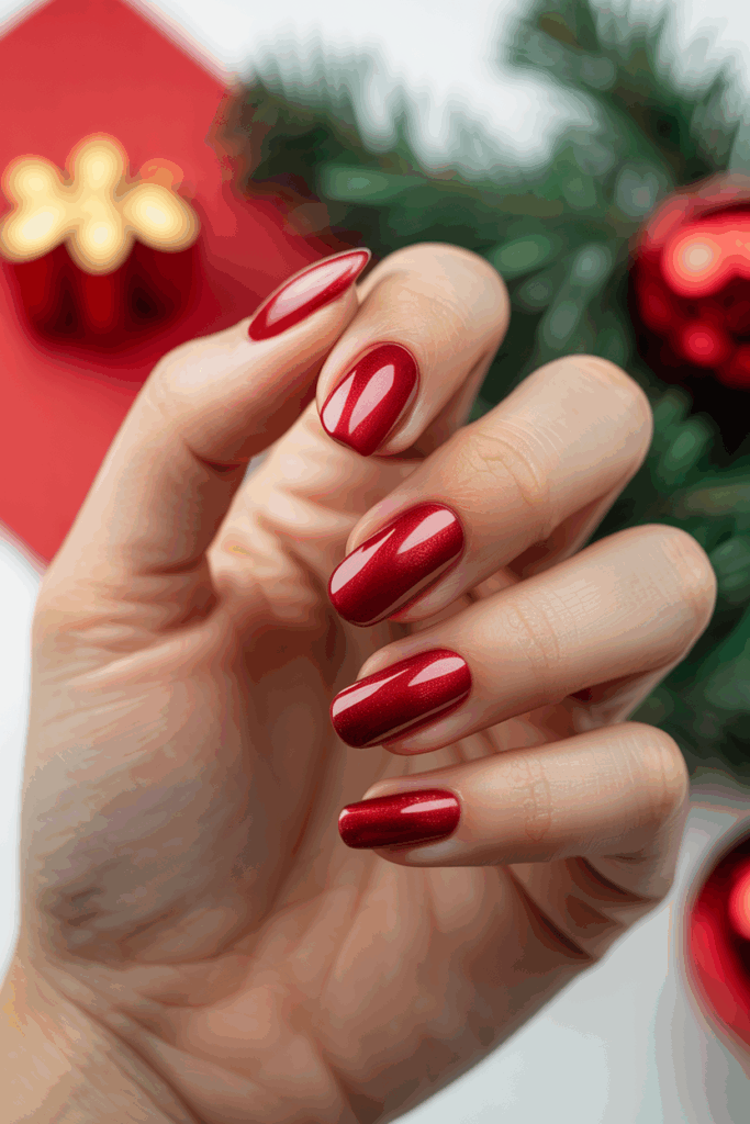 Classic glossy red nails are simple, elegant, and always in style. They create a clean and polished look that pairs beautifully with any holiday outfit. The glossy finish adds just the right amount of festive shine without feeling overdone. This style works perfectly on both short and long nails.
