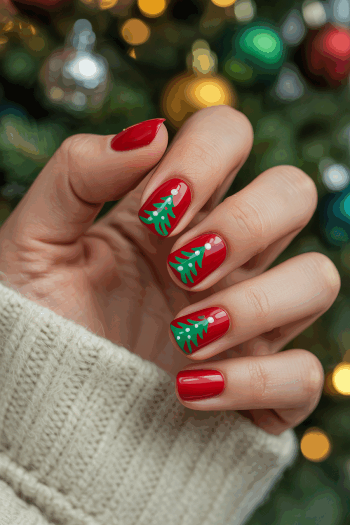 This festive style features bright red nails decorated with small green Christmas trees. The trees often include simple accents like dots or stars for added charm. The design feels cheerful without being too busy, making it ideal for those who want a classic holiday look with a playful twist.