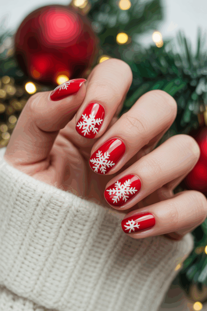 This design pairs a bright red base with crisp white snowflake art. The contrast allows the snowflakes to stand out clearly and beautifully. It works well on both short and long nails and offers a classic winter look suitable for many holiday occasions.