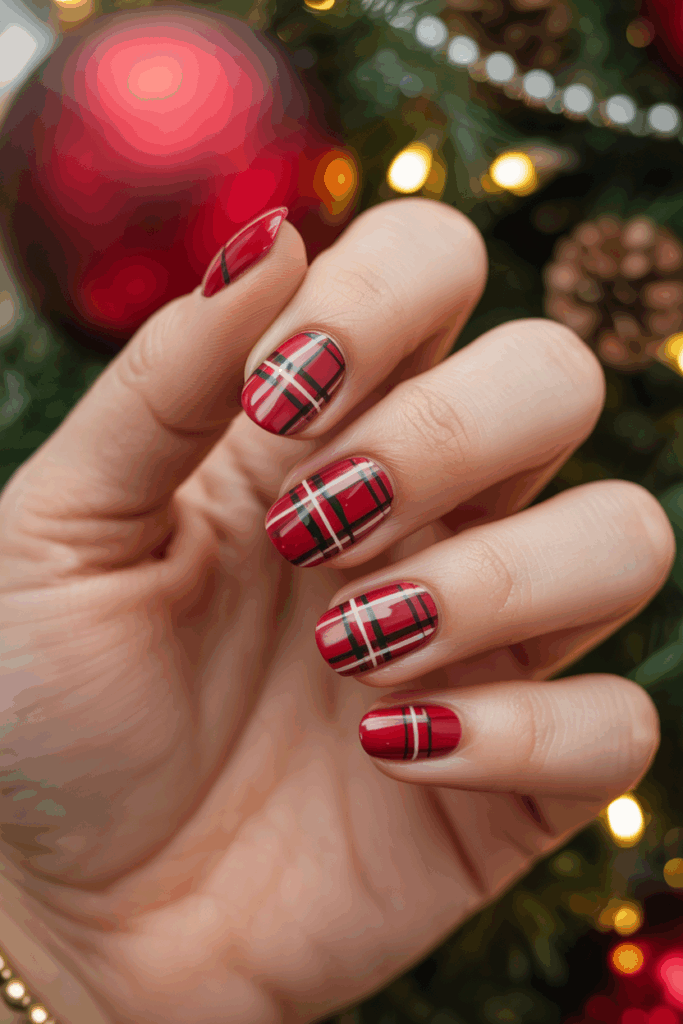 Red plaid nails create a cozy, traditional Christmas vibe. Typically, a red base is paired with black or dark brown striping to form the plaid pattern. This design is relatively simple to create but instantly adds warmth and festive charm to any manicure.