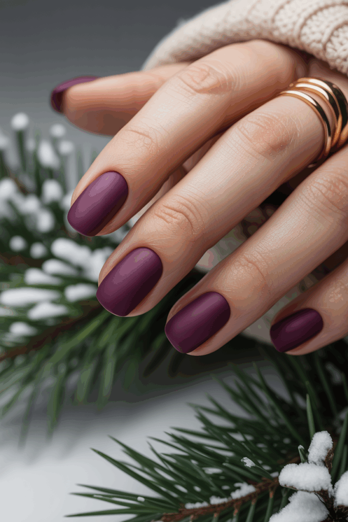 Deep plum purple nails with a matte finish offer a refined and sophisticated appearance. The shade feels rich and luxurious, perfect for winter. Adding a single glitter or jewel accent nail introduces a hint of elegance without taking away from the clean look.