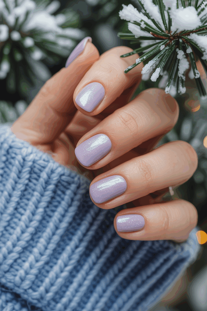 Frosted lavender nails create a soft, graceful winter look. The gentle shimmer reflects light delicately, adding just enough sparkle. This style pairs effortlessly with cozy knits and winter outerwear, making it ideal for anyone who loves simple yet polished nail designs.