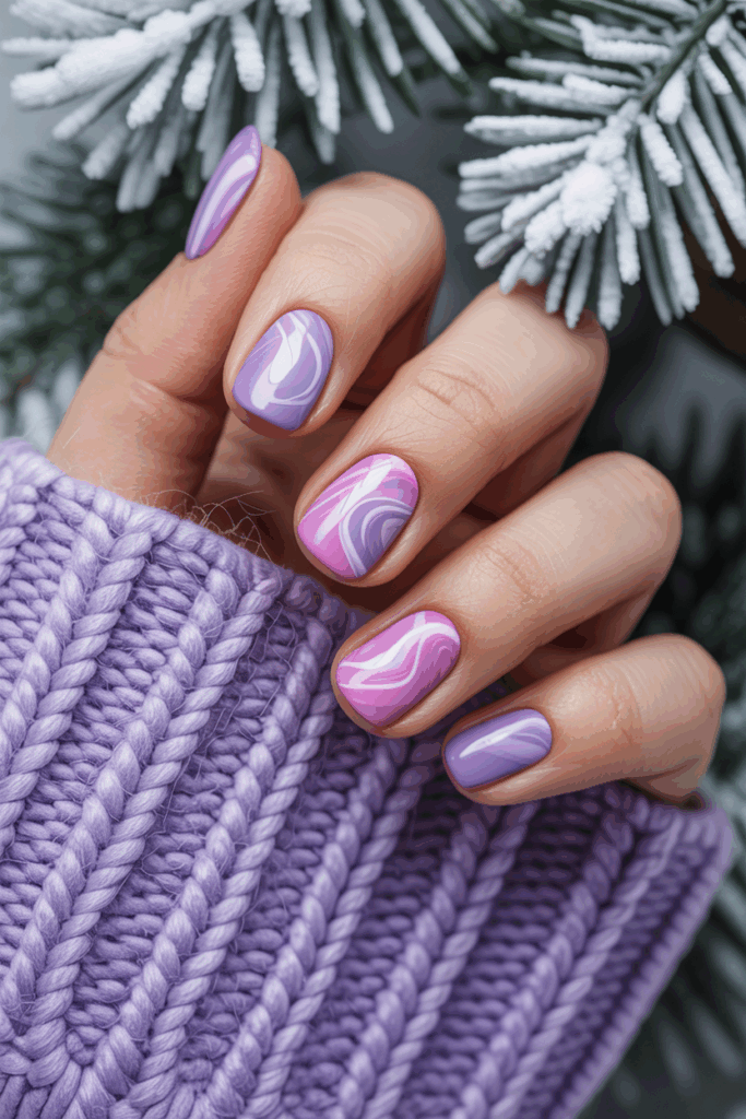 Swirled purple and pink nail art blends the two shades into smooth, flowing designs on each nail. The colors mix naturally, creating a soft and artistic effect.