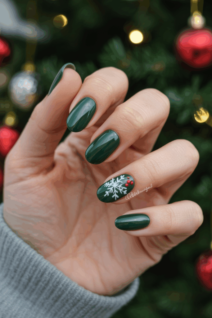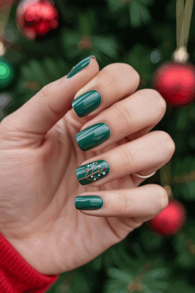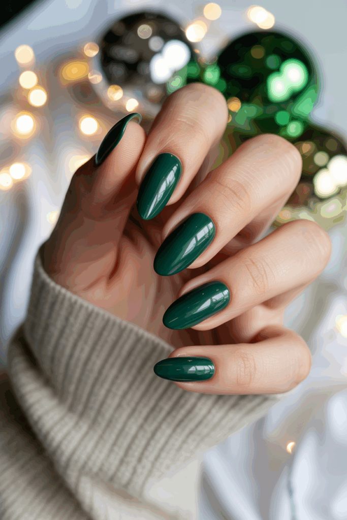 It complements all skin tones and pairs perfectly with metallic jewelry or party outfits. You can even enhance emerald nails with glitter accents or art inspired by garlands and wreaths.