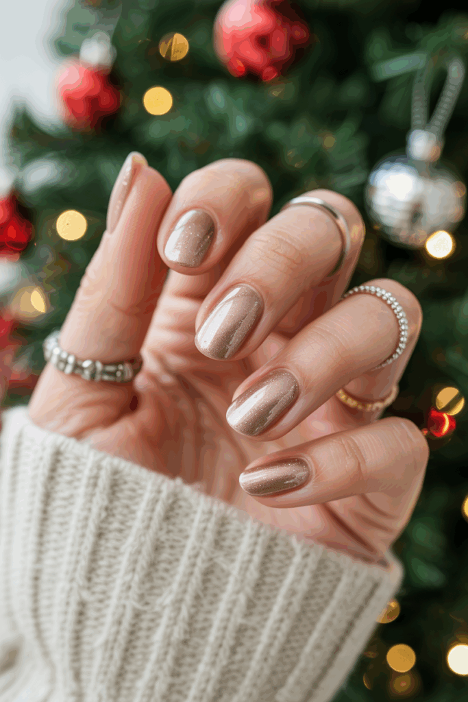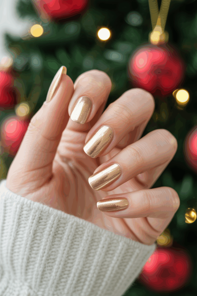 Rose gold has become a beloved modern classic, offering a feminine twist on holiday metallics. Its pink undertones make it soft yet sparkly — ideal for chic Christmas manicures.