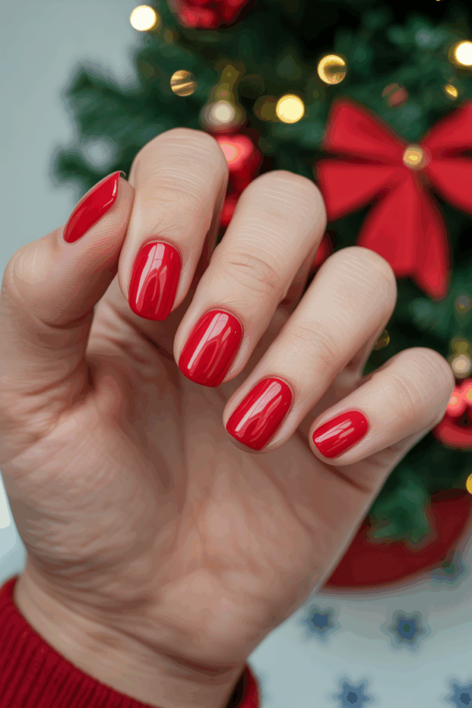 Nothing captures Christmas spirit quite like a glossy candy apple red manicure. This vibrant and cheerful hue mirrors timeless holiday elements — from ribbons and ornaments to Santa’s iconic suit. It looks stunning under twinkling lights and instantly brightens any outfit.