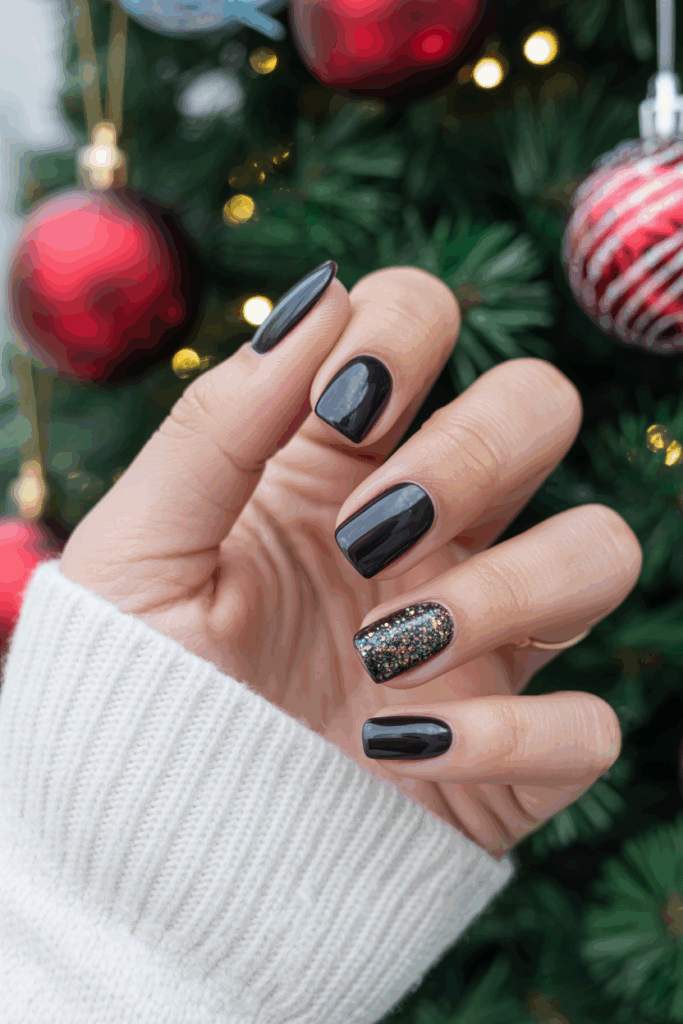 Black nails may seem more suited to Halloween, but when paired with glitter or metallics, they become wonderfully festive and sophisticated. Midnight black is the perfect backdrop for gold foil, silver sparkles, or rhinestones.