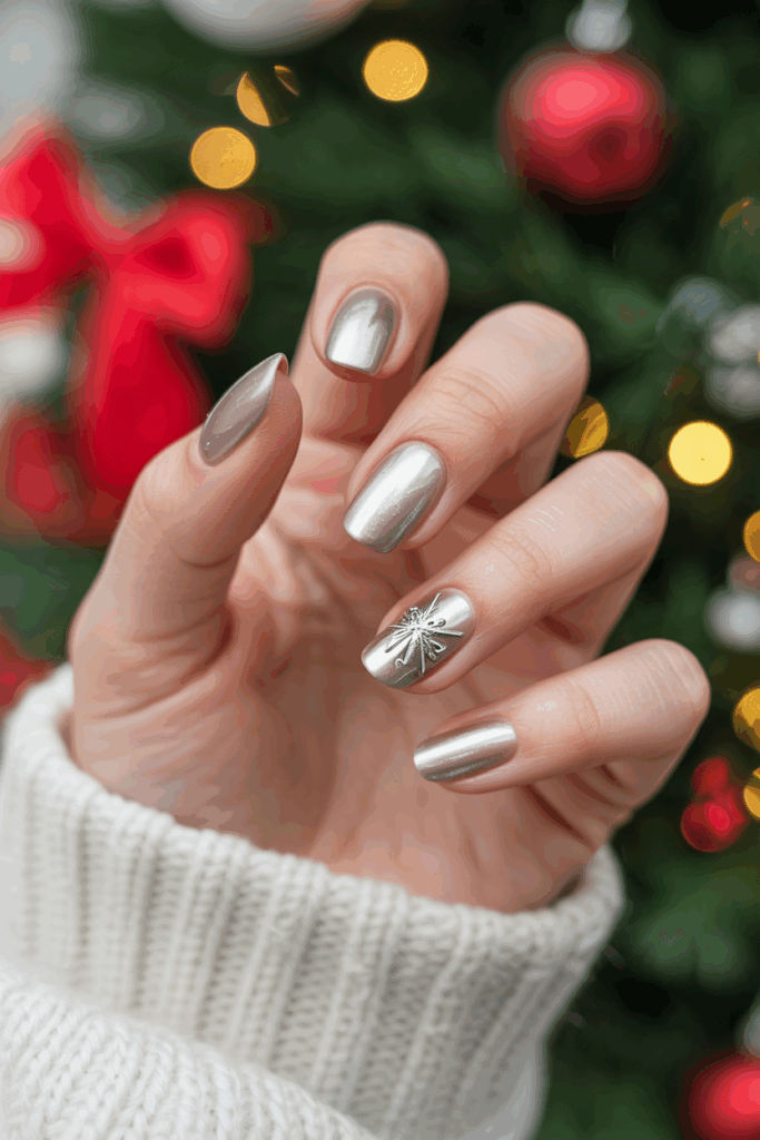 Silver chrome nails give off a sleek, futuristic winter vibe. Their mirror-like shine makes them perfect for festive events and holiday nights out.