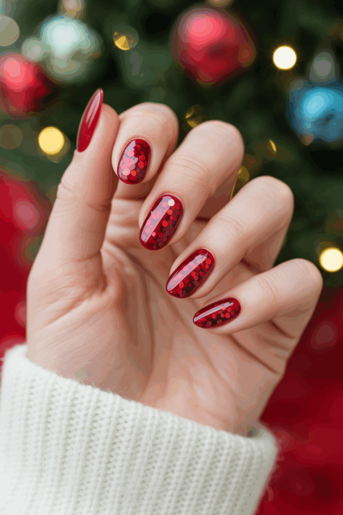 Ruby glitter nails bring the sparkle of Christmas ornaments right to your fingertips. With a deep red base and glowing glitter flecks, this shade catches the light and adds instant holiday charm.