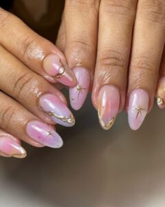 If you want something glamorous, this gold-star design is a showstopper. Each nail has a sheer wash of pink, lilac, and yellow, topped with metallic stars, fine lines, and golden accents. It feels luxurious and summery all at once.