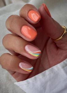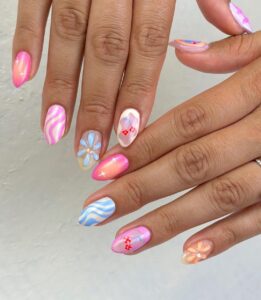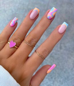 These groovy pastel swirls look straight from the ’60s. Nude nails with two-tone French tips sit next to bright swirled designs in blues, oranges, and pinks. Fun, nostalgic, and ideal for retro lovers.