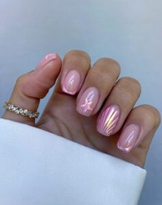 These dreamy seashell nails sparkle beautifully in natural light. A glossy nude base sets the stage for iridescent pink tips, shell accents, and tiny starfish. They’re whimsical, beachy, and perfect for any seaside getaway.