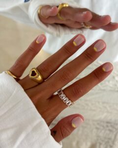 If you love neutrals but want a summery edge, this reverse French design is perfect. A glossy nude base is paired with a crisp half-moon of bright yellow at the cuticle. It’s subtle, chic, and sunshine-approved.