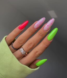 Neon lovers, this one’s for you! Bright green and hot pink create a vibrant contrast. Two nails are neon green, one is solid pink, and the remaining nails mix both shades in spotted, abstract patterns for a fun summer punch.