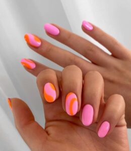 Bold, bright, and full of personality—this pink-and-orange combo steals the show. Solid orange sits beside bubblegum pink, while the middle nails mix both colors in curvy abstract waves for a punchy, modern manicure.